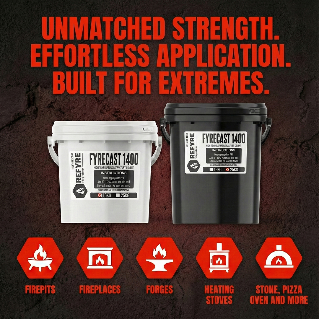 Our FYRECAST 1400 Refractory Cement is a high-performance, dry-mix castable cement engineered to handle temperatures up to 1400°C, making it the ideal solution for demanding applications such as pizza ovens, fireplaces, forges, ovens, kilns, and custom castings. This product chemically sets and cures without the need for heat, providing brick-like hardness and long-lasting durability. Just add water.